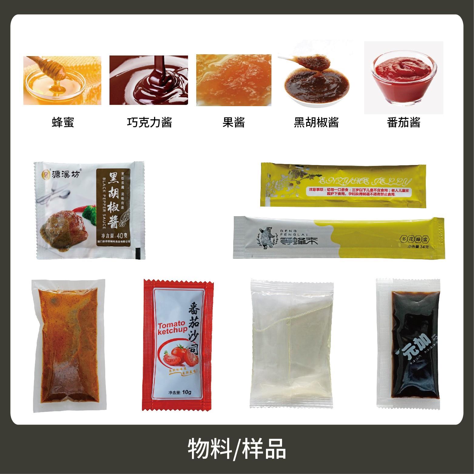 1、適用于食品、醫(yī)藥、化工、化妝品行業(yè)中液體、醬料物品的計量包裝,如:番茄醬、辣椒醬、黑胡椒醬、貓條等。